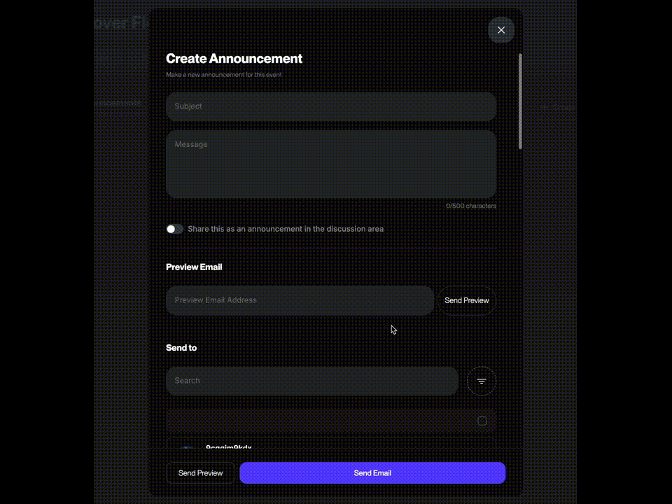 Besides sending preview emails to test your announcements, event organizers get granular control over whom theyāre sending them to! Like a proper CRM. Approval status, those going, those interested but who havenāt bought a ticket yet, invitees who have declined, etc. You can even upload a custom .csv if you have a list elsewhere.