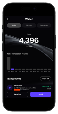 It works just like any other Lightning wallet: Pay, Send and Receive. But where it gets cool is how you can use it on Satlantis to buy event tickets with one click, withdraw your Bitcoin earnings from events you run to your own native wallet, and (very soon) send money to your meet up attendees and watch them experience the power of Lightning first hand, without needing to download and install other apps.